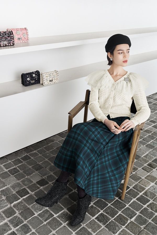 グリーンとブルーを繊細に重ねた、他にはない配色バランスが魅力のチェック柄スカート。オリジナルで描き起こしたデザインが、秋のムードを一層引き立ててくれます。合わせるトップスは、顔まわりを華やかに演出するチュール襟が印象的なニット。エレガントでありながら旬を感じさせる、秋のモダンスタイルの完成です。