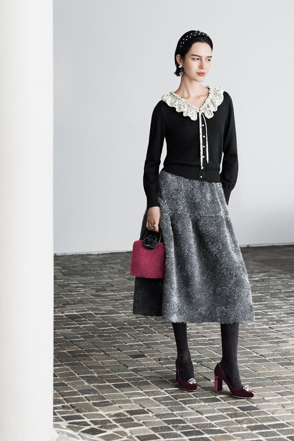 ふわりと広がるシルエットに、立体的なチュールテープ刺繍が映えるドラマティックなボリュームスカート。合わせるのは、デコルテラインを美しく魅せるフリル付きのニットトップス。軽やかに揺れるディテールが、歩くたびに優雅なムードをまとわせてくれます。