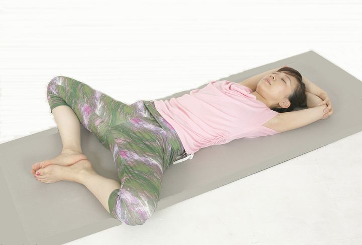 1)左脚を後ろへ伸ばし、右脚は体の前で内側に曲げる。