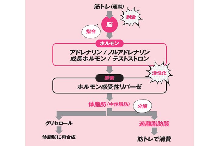 筋トレを行うと、脳が刺激されてテストステロンや成長ホルモンなどを分泌する指令を出します。それらのホルモンがホルモン感受性リパーゼという酵素を活性化し、中性脂肪は遊離脂肪酸とグリセロールという物質に変換されます。グリセロールは再び体脂肪に戻りますが、遊離脂肪酸は血中に放出され、体を動かす燃料として使用されます。