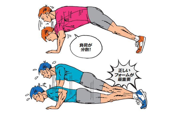 正しいフォームを維持できるようになったら、回数やセット数を徐々に増やしていきましょう。上体を床に近づけたとき、腰が曲がって尻が上がったり、腰が反ったりしてしまうと負荷が分散して、筋肉にしっかり刺激を入れられなくなってしまうので注意しましょう。ツラくて正しい姿勢が保てない人は、ヒザを床につけて行ってもOK。まずはその体勢で正しいフォームを身につけ、慣れてきたらつま先立ちで行うのがおすすめです。