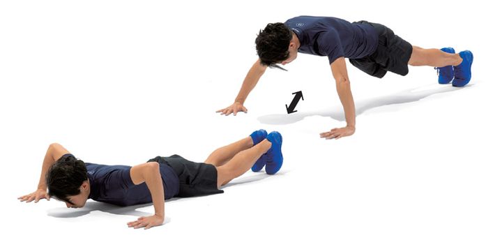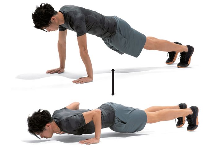 両手両足を床につけ、ヒジを伸ばしながらつま先で立ちます。手の位置は肩幅くらいを目安に、背すじをまっすぐに伸ばしましょう。肩はすくめず、後頭部からカカトまでを一直線にするのがポイントです。上体を下げる時は、ヒジを曲げながら、胸が床に接するギリギリくらいまでゆっくりと。この時、後頭部からカカトまでの直線状態を崩さないように注意。ゆっくりと元の姿勢に戻り、これを繰り返します。