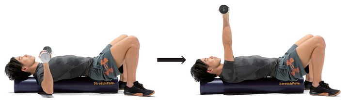 両ヒジを曲げてダンベルを順手で両手に持ち、台の上に寝ます。ヒザは90度くらいに曲げて、両足を床につけます。ダンベルを胸あたりで構え、ヒジをゆっくり伸ばしながらダンベルを持ち上げましょう。胸を張り、腰を反らさないように注意しながら、再び胸の脇まで下ろします。