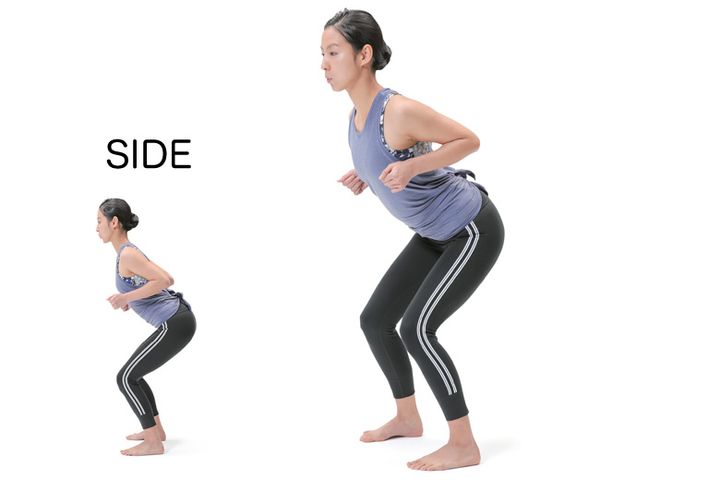 両手を握り、息を「フー」と吐きながらヒジを曲げて腕を後ろに引き、同時にヒザがつま先より前に出ないように腰を斜め後ろに引きながら落とします。