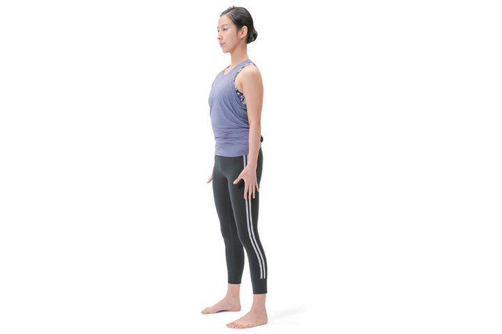 スタートは脚を肩幅よりやや広めに開いて立ち、手を真横に下ろして余計な力を抜いて、視線は正面に向けます。これが基本のスタンバイ姿勢になります。
