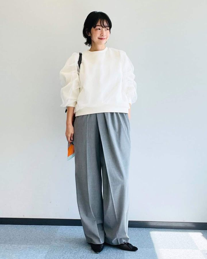 袖チュールで一気にドラマチック。スウェット感覚で着れて楽ちんなのに一枚で可愛いトップスに、タック入りワイドパンツを合わせてバランス良く。白×グレーのモノトーンで洗練された印象に仕上がります。
