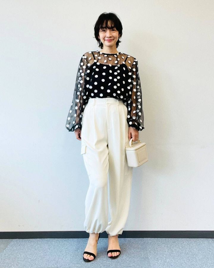 程よくボリュームのあるブラウスを、パンツスタイルでスッキリまとめバランス調整。甘さのあるドットも、透け感とモノトーン配色で大人っぽく着られるので、オンオフどちらにも着回し可能。週末のディナーやおしゃれしたい女子会、ちょっと特別感を出したいお出かけにぴったりです。