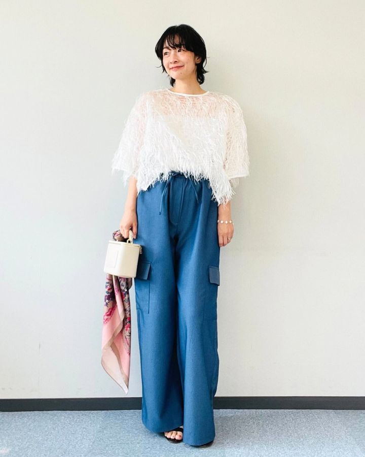トレンド感のあるフリンジトップスを主役に、リラックス感のあるワイドパンツやカーゴパンツでバランスをとった大人の余裕見えコーデ。コンパクトなバッグやスカーフを効かせて、女性らしい華やぎをプラスしました。