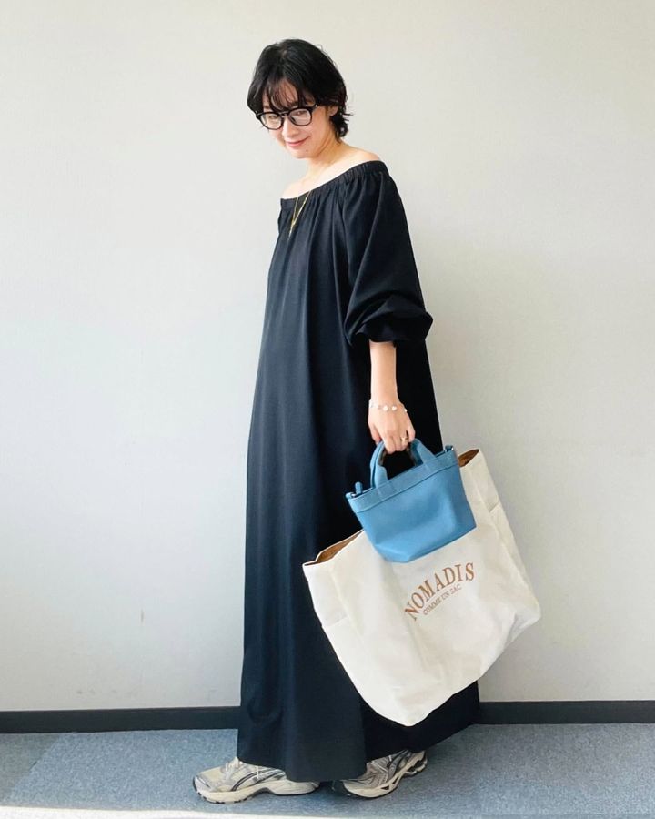 贅沢な生地感でふわっとボリュームが大人の余裕を演出。ノンストレスなのに、一枚でこなれて見えるリラクシーワンピです。オフショルは気分で肌見せの調整が可能。ミニトートとスニーカーでオフ仕様にコーデしました。ヒールやベルト、アクセを足すと華やかに。小物次第で昼も夜もいける万能アイテムです。