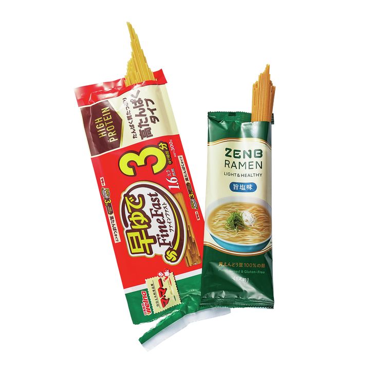 左・早ゆで3分だから火を使いたくない暑い日にも嬉しい。マ・マー 早ゆでスパゲティ FineFast 高たんぱくタイプ 1.6mm 300g×5袋¥2,280〈編集部調べ〉(日清製粉ウェルナ)右・食物繊維や鉄分も。ゼンブラーメン旨塩味 1袋 ¥398(ZENB)
