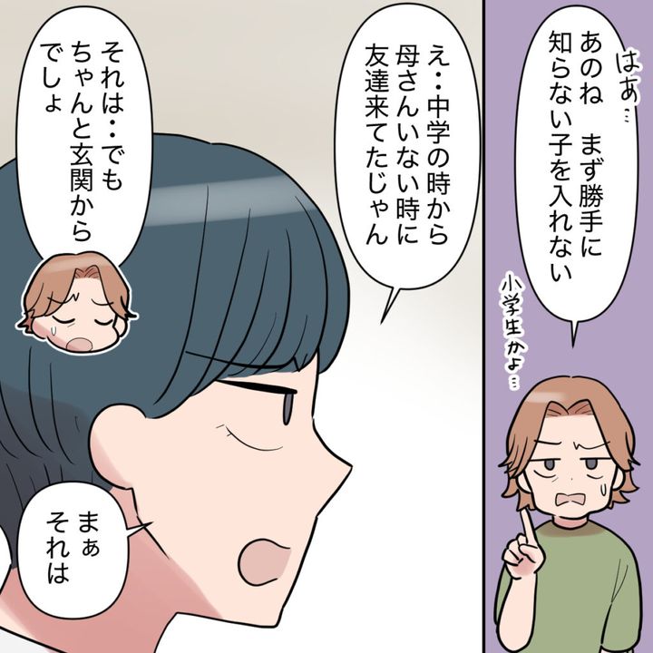 「はぁ・・あのね、まず勝手に知らない子を入れない」小学生かよと思いながらそう言うと、「え・・中学の時から母さんいない時に友達来てたじゃん」とミズキが反論。「それは・・でも、ちゃんと玄関からでしょ」私の言葉に、「まぁ、それは」とミズキが渋々答えました。