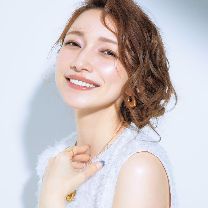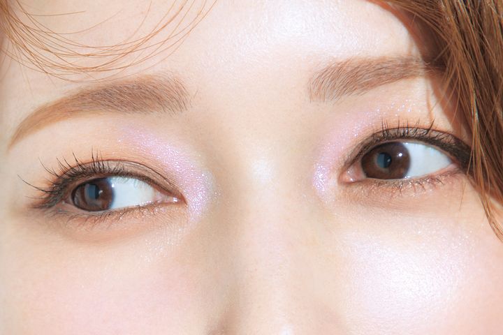 自然なツヤ肌となじみの良いブラウンアイメイクがカギ。アイラインもブラウンで、いつもより目尻を長めに。偏光シャドウはチップに取り目頭に置いたら、そのまま上まぶたに向かってサッとのばして。チークは多幸感あふれるピンク系を頰の高めの位置に広く入れ、さらにシアーなリップで仕上げることで、全体のバランスも整います。