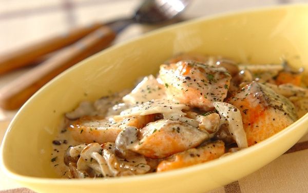生クリームや粉チーズの濃厚ソースが、鮭とキノコにからんで絶品です。白ワインで蒸し煮にするため、鮭がパサつかずしっとりしますよ。ソースは火を通しすぎると口当たりが悪くなるため、ひと煮たちしたらすぐに火を止めましょう。リッチな味わいは秋のおもてなしに喜ばれます。