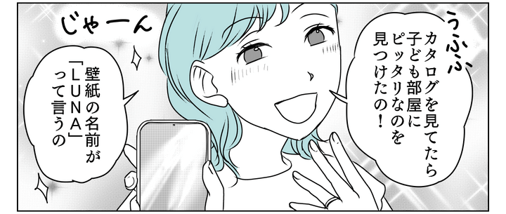 私は新居の内装を考える中、「LUNA」という壁紙を見つけました。「ルナ」はお腹の子につけようと思っている名前でもあります。