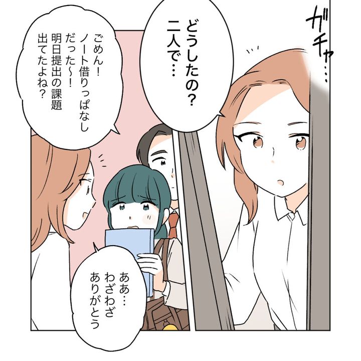 そして、「どうしたの?二人で・・」驚いてドアを開けるカエデに、「ごめん!ノート借りっぱなしだった~!明日提出の課題出てたよね?」シズクが謝ると、「ああ・・わざわざありがとう」とカエデは静かに答えました。
