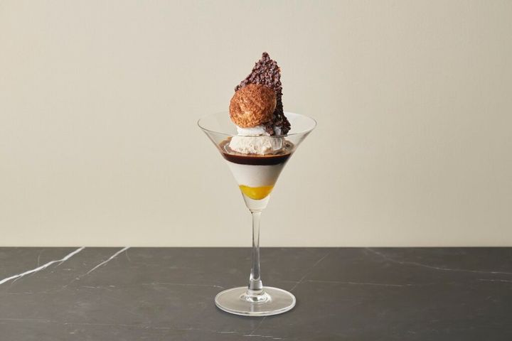 この食べるのがもったいないくらいの美しさを纏うパフェは、東京・銀座『GINZA SIX』内に9月5日にオープンしたばかりの『マルニ カフェ』のシグネチャーメニュー。東京を代表するパティスリー『パティスリィ アサコ イワヤナギ』が手がけ、〈マルニ〉が表現する色彩感覚を生かしたアーティスティックなデザートだ。今の季節は、シャインマスカットやブドウをメインに使い、クレームシャンティ、モンブランクリーム、栗はちみつブランマンジェを織り込み、レモンやライムスカッシュジュレで爽やかさをプラス。チュールのようにトップに飾られたミントの飴細工やレモン味のショートブレッドが食感を楽しませてくれる。その繊細さと一口ごとに訪れる驚きは、まさにプレイフルな1品。