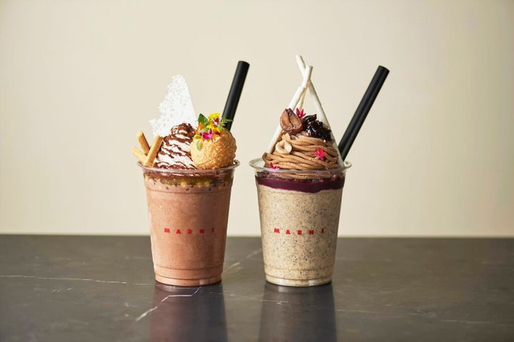 ギフトボックスに入ったバターサンドや塩チョコレート、イタリアの伝統菓子・カンノンチーニなどといった店頭に並ぶテイクアウトメニューにも注目を。素材の味を活かしたジェラートや、フレッシュバナナを使用したジェラートドリンクにティラミスやモンブランをトッピングしたスムージーパフェは、エディブルフラワーでかわいく彩られ、まるで小さなガーデンのよう。10月1日には、〈マルニ〉のギフトボックスにも採用されているカラーコードでデザインされた缶に入った、クッキーとバーチディダーマ、ロシェの3種類が新しいテイクアウトメニューに仲間入り。ブランドならではの世界観を自宅や店外でも楽しみたい。