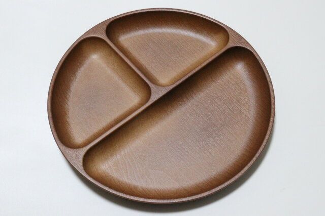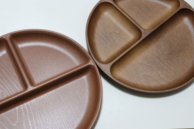 温かみのある木目調のニュアンスで、マットな質感。よくある子ども用の仕切り皿と違い、プラスチック感やチープな印象のないアイテムです。