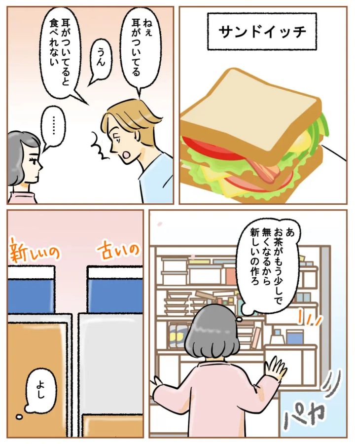 ナズナさんが冷蔵庫を開けると、お茶がもうすぐ無くなりそう。新しいお茶を作って隣に並べた後、少しして冷蔵庫を開けると何かがおかしい。新しいお茶の方が減っているのに気づきツカサさんにたずねると、「新しいほうがいい」と即答。自分でお茶を作る気は全くなく、「気づいた人がやればいいじゃん」と言い切るツカサさんに、腹立たしさしさ感じませんよね。