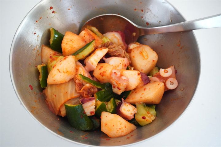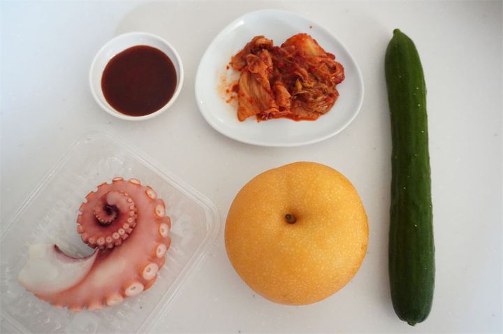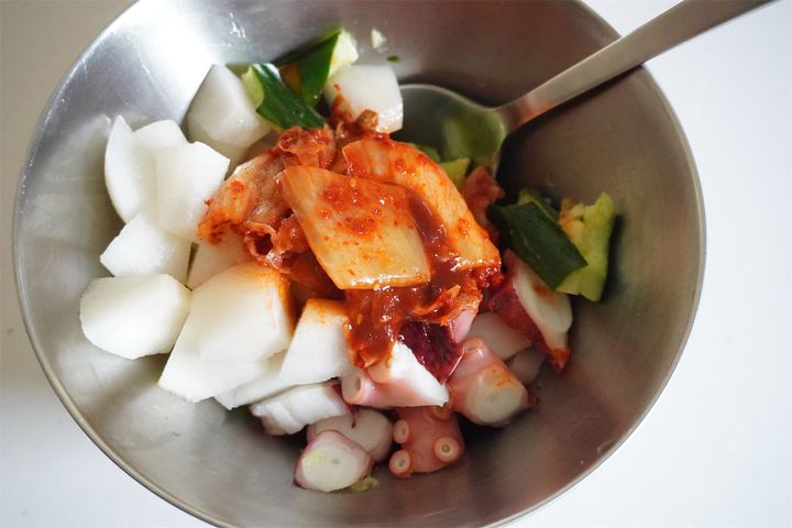 3. ボウルに梨、タコ、きゅうり、キムチ、キムチの素を混ぜ合わせる。