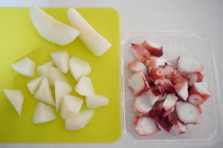1. 梨とタコは、ひと口サイズの乱切りにする。