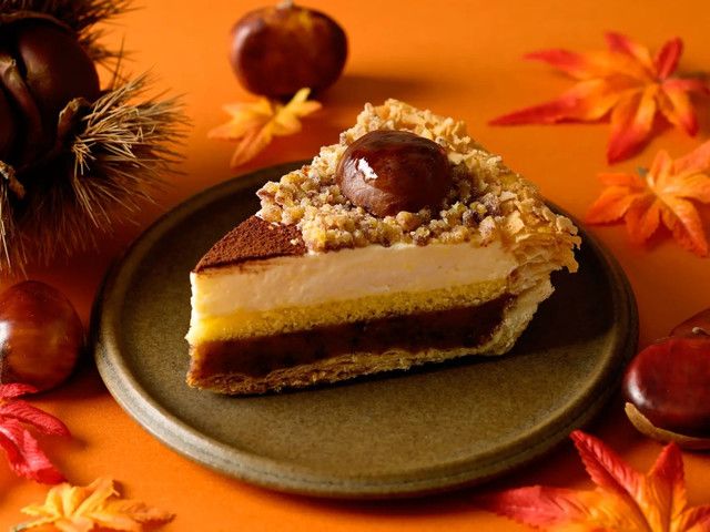 どこから食べても栗の味わいを満喫できる、栗づくしの季節限定パイです。 パイの上に渋皮栗ペーストクリームとカスタード入りクリームを重ね、上面にはクラッシュマロンを散らし、渋皮栗を飾りました。香ばしい渋皮栗とまろやかな甘さのカスタード入りクリームが生み出す、上品でコク深い味わいをお楽しみください。