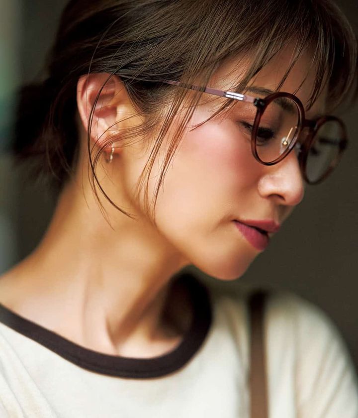 横長チークと伊達メガネの存在感で、ナチュラルメークの物足りなさを回避。