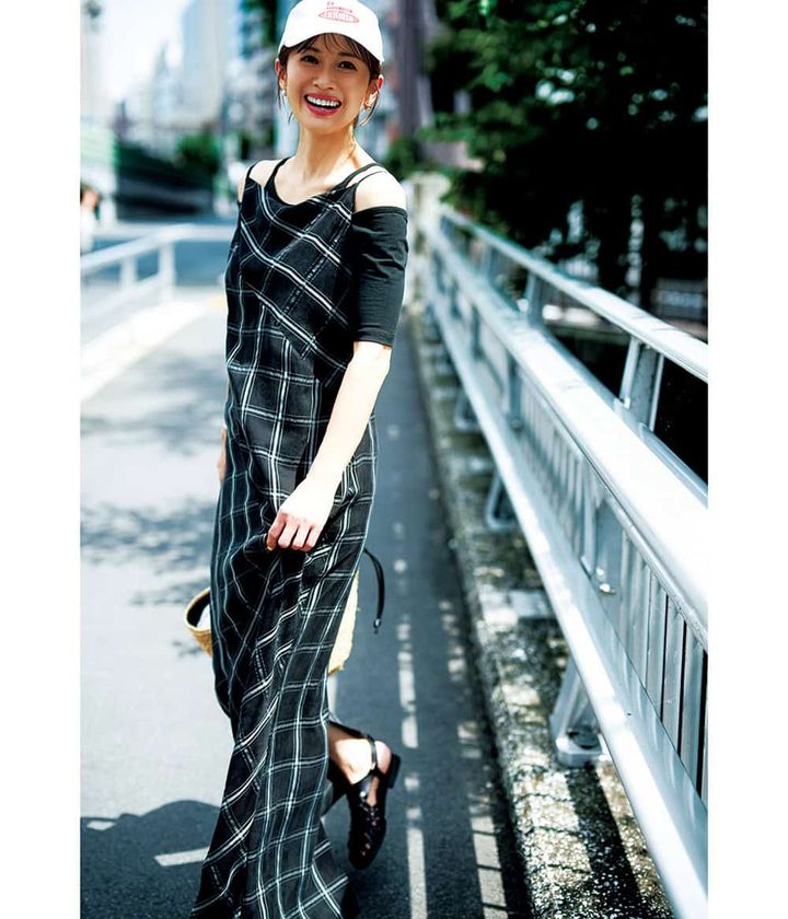 キャップ¥8,250(ザ シンゾーン/シンゾーン ルミネ有楽町店)肩に巻いたカーディガン¥14,300(セルフォード/セルフォード ルミネ新宿2店)ワンピース¥24,200(メゾンスペシャル/メゾンスペシャル 青山店)タンクトップ¥13,200(ティッカ)バッグ¥145,200(ピエール アルディ/ピエール アルディ 東京)サンダル¥17,600(メリッサ/メリッサ シューズ ジャパン)ピアス¥8,800(ゴールデン モンステラ/H 3Oファッションビュロー)ブレスレット¥25,300(ワンエーアールバイウノアエレ/ウノアエレ ジャパン)