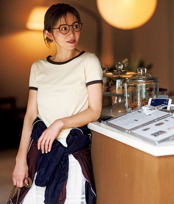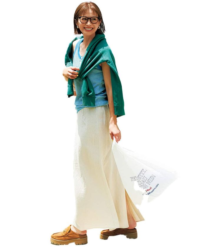メガネ¥26,180(カリン/WTSROOM)Tシャツ¥6,930(シールームリン)腰に巻いたジャケット¥22,000(アルページュストーリー)スカート¥19,800(メゾンスペシャル/メゾンスペシャル 青山店)バッグ¥47,300(ヴァジック/ヴァジックジャパン)シューズ¥14,960(ニューバランス/ニューバランスジャパンお客様相談室)ピアス¥79,200※片耳価格(プライマル)