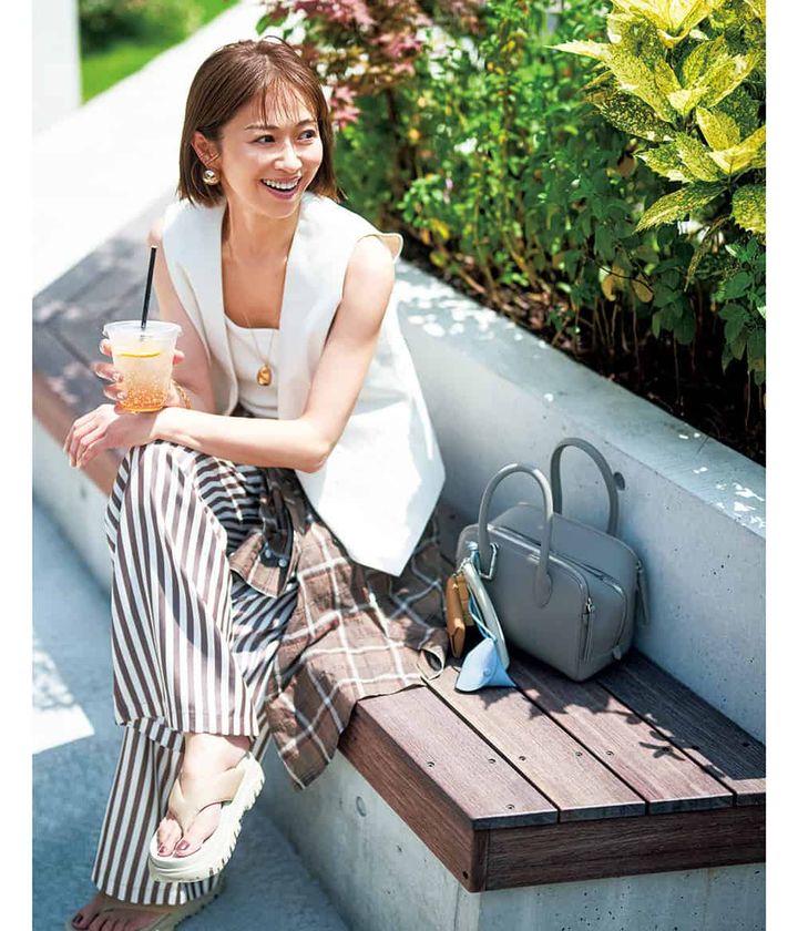 ピアス¥24,200(マユ/マユ ショールーム)ネックレス¥55,000(リューク)ブレスレット¥14,300(ワンエーアールバイウノアエレ/ウノアエレ ジャパン)ジレ¥27,500(ザ シンゾーン/シンゾーン ルミネ有楽町店)タンクトップ¥5,940(シールームリン)腰に巻いたシャツ¥18,700(アルページュストーリー)パンツ¥34,100(ザ ニュー ソサエティ/サードマガジン)バッグ¥53,900チャームセット※ポップアップ限定¥5,500~(ともにヴァジック/ヴァジックジャパン)サンダル¥15,400(シャカ/ブルームーンカンパニー)