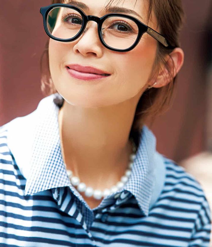 パイピングやポロシャツのような旬のスポーティトップスをキリッと引き締める伊達メガネ。目元をいい具合にカモフラできるから、真夏の大人の救世主。アイメークは控えめに、日焼け風の横長チークとリップを同色で取り入れれば、手っ取り早く健康的な印象に。