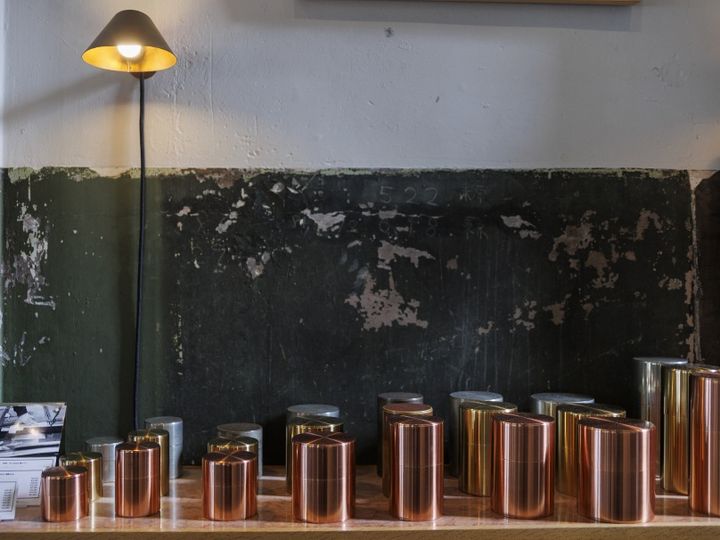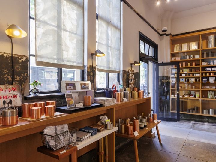 老舗の工芸品というと少し緊張をしてしまいますが、そんな開化堂の商品に触れたことがない人にも、カフェを通じて気軽に触れてみてほしいという思いからスタートしたのが「Kaikado Café」。店内の物販スペースには茶筒をはじめ、コーヒー豆や茶葉、カップ、アパレルなど、開化堂のオリジナルアイテムが並び、誰でも手に取ることができます。