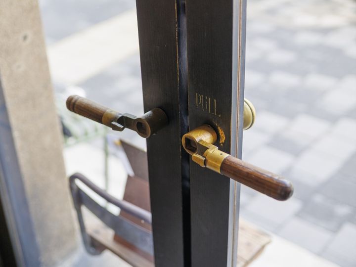 扉のドアノブには市電のレバーが再利用されていました。こういった細かい点に注目するのも、レトロ建築ならではの楽しみです。
