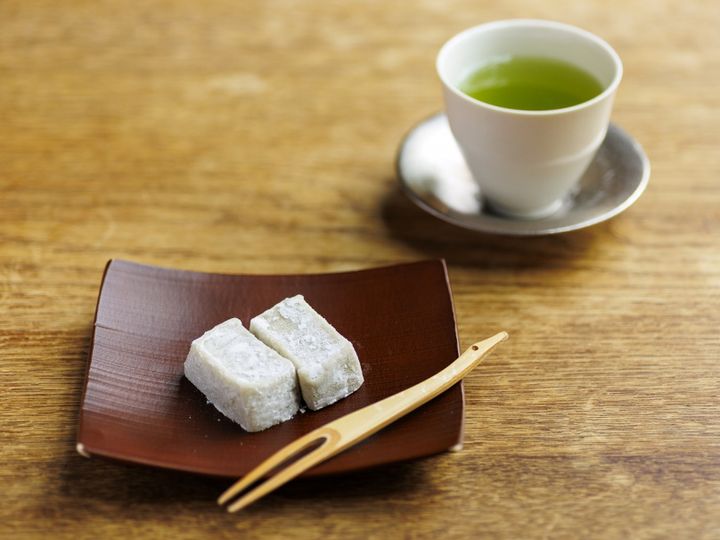 京都祇園の和菓子店「鍵善良房」がつくるカフェオリジナルの餅菓子「カラキ餅セット」1600円。カラキとは沖縄シナモンのことで、一般的なシナモンより優しい風味が特徴です。カラキの葉の粉末を使った求肥餅は、日本茶だけでなく紅茶やコーヒーにもよく合います。
