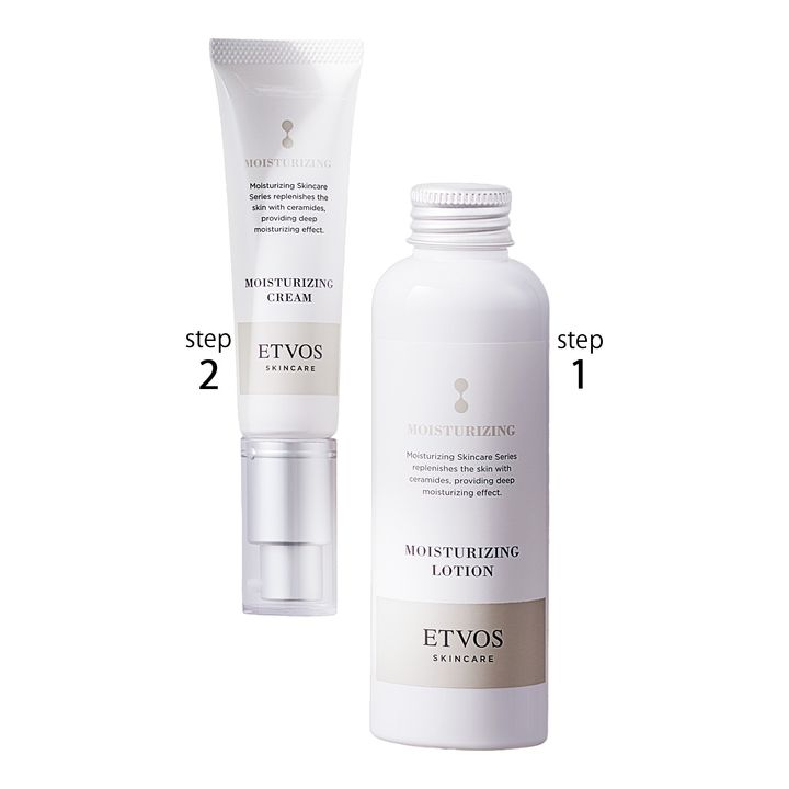 肌に存在するセラミドと同じ構造のヒト型セラミドを配合。肌が敏感な時にも優しく使え、ゆらぎにくい肌に導く。モイスチャライジングローション150㎖¥3,630、同クリーム 30g ¥4,290(ともにエトヴォス)