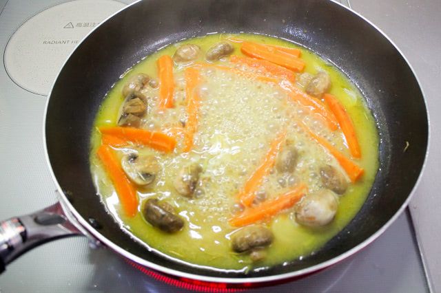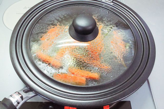チキンブイヨンを半分くらい加えて、にんじんを煮ます。