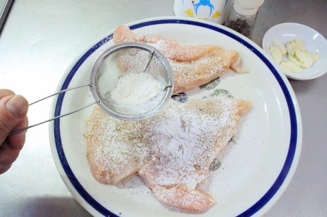4. 2の鶏肉からにんにくを取り除き、両面に塩、黒こしょう、薄力粉をまぶします。