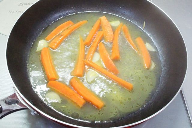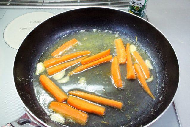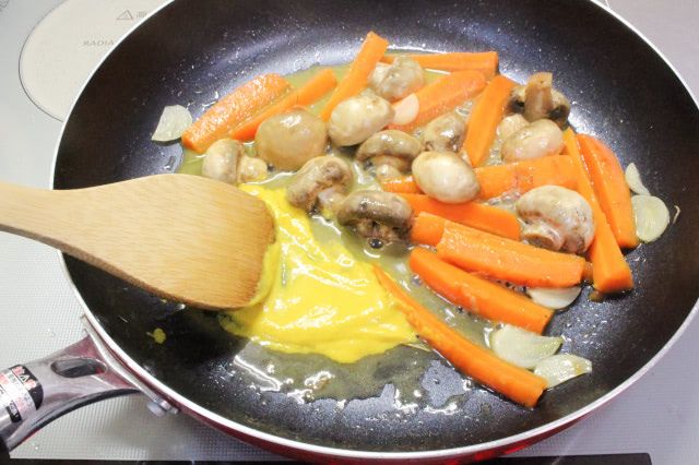 にんにくを先に炒めて香りを出したところで、にんじんを投入。バターで2分ほど炒めて、甘い風味をまとわせました。にんじんはクミンとの相性がいいことから、カレー粉を少し加えます。