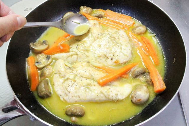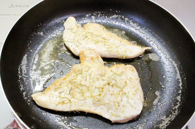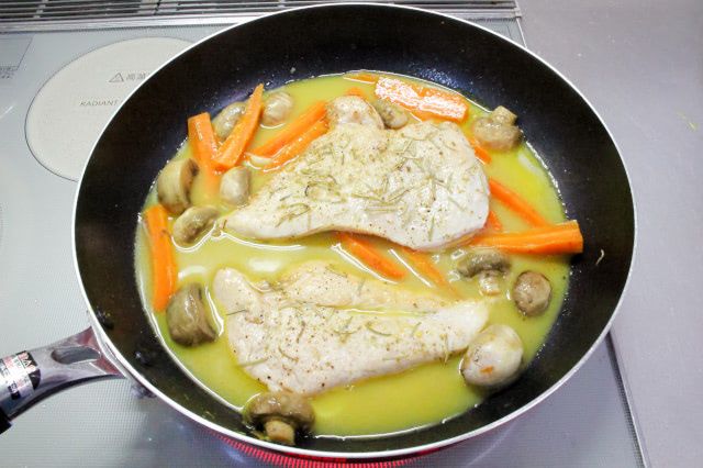 ハーブをまぶして焼いた鶏肉を戻し、フタをして2分ほど煮ました。