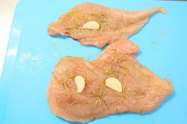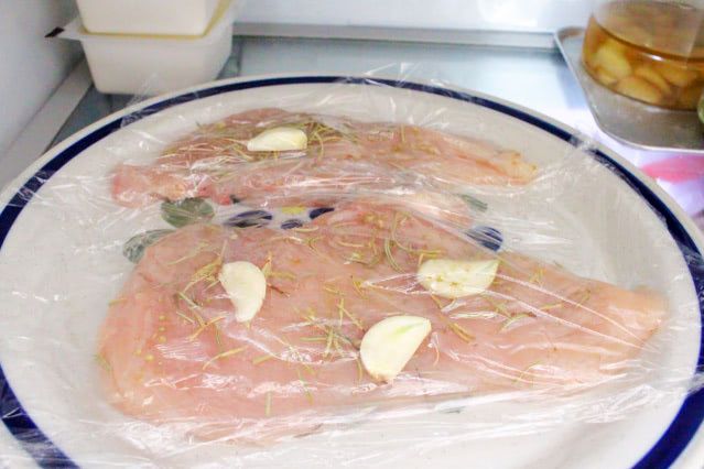 2. 鶏肉の両面にハーブをまぶしてにんにくを乗せ、ラップをかけて、冷蔵庫で20分ほど寝かせます。