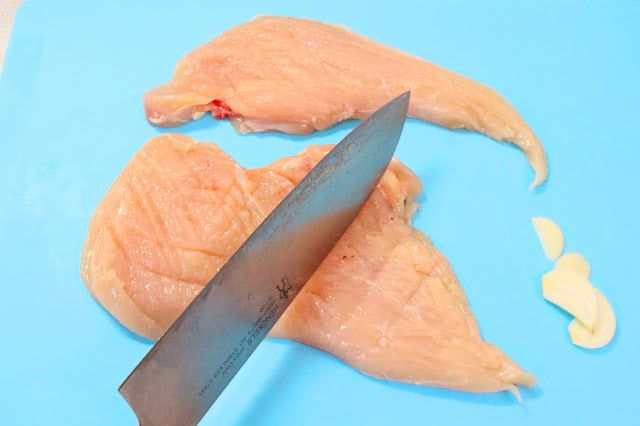 1. にんにくを2mm幅くらいの薄切りにします。鶏肉は皮を取り除いて半分の厚さに切り、包丁の背で軽く叩いておきます。