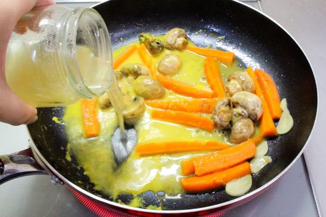 6. 5のフライパンにバター(5g)を入れて中火で熱し、にんにくとにんじんを入れて塩(ひとつまみ)を振って軽く炒めます。チキンブイヨン(約150ml)とカレー粉も加えてフタをし、弱火で7~8分煮込みます。