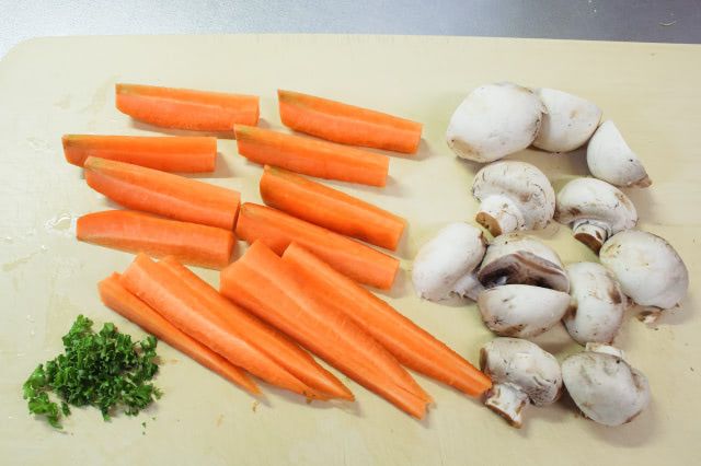 3. 皮を剥いたにんじんを10等分程度に、マッシュルームを半分に、イタリアンパセリを粗みじん切りにします。