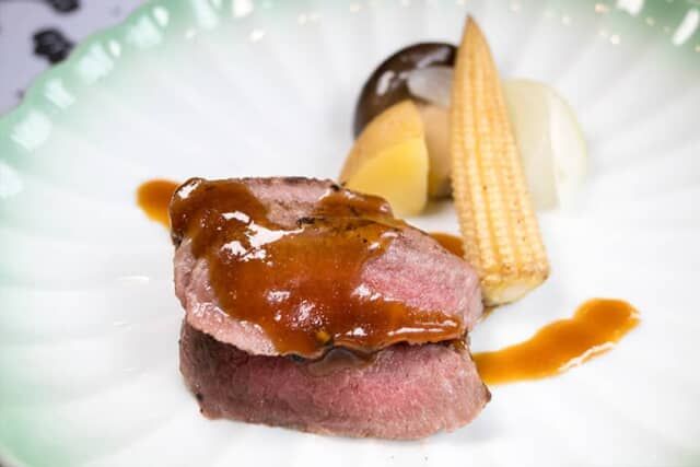 ▲「京の肉「琥珀和牛」ステーキ ~九条葱と山椒のソース~ 低温調理にて」