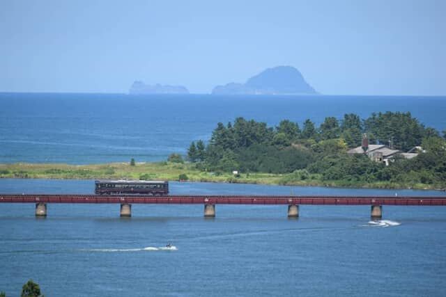 由良川の河口を一直線に通る由良川橋梁。水面から線路の高さはわずか6m。客席の窓からは海の上を渡っているように見える人気のスポットです。
