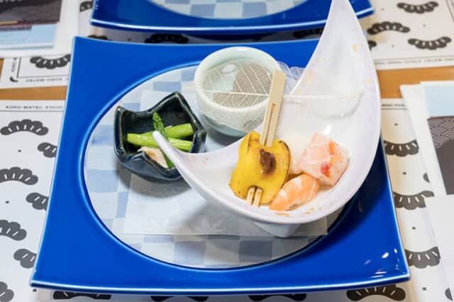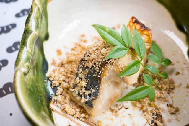 羽衣天女が最後に住んだと伝わる京丹後市弥栄町。近海で獲れた鰆を、弥栄町にある竹野酒造の酒粕を使った幽庵地に漬け込み焼き上げたひと品。口の中に焼栗の優しい甘さや魚の旨味が広がりました。