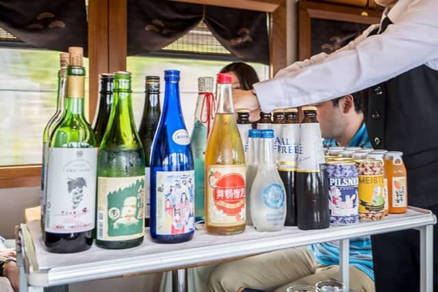 地上に降りた天女は酒造りに秀で、万病に効く “霊酒” と評判になったのだとか。車内販売のアルコールやソフトドリンクも、京都丹後鉄道沿線のご当地の品を用意。日本酒はワンショット¥400からとリーズナブル。料理とともに地元の味を楽しめます。