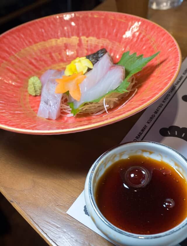 宮津駅を通過してほどなくすると、水平線に横一文字の天橋立が見えました。この日のお造りは、かんぱち、鰆、すずきで、醤油はセントラーレ特製醤油に地元の醸造所「小野甚」の醤油をブレンドして、絹のような羽衣をイメージした「泡醤油」です。