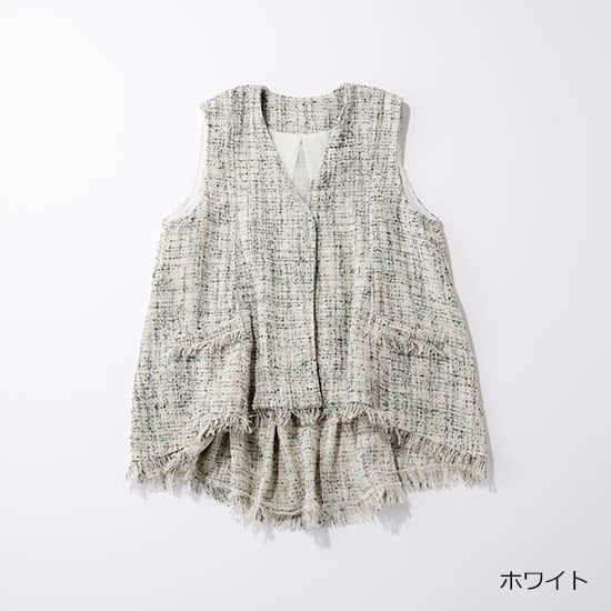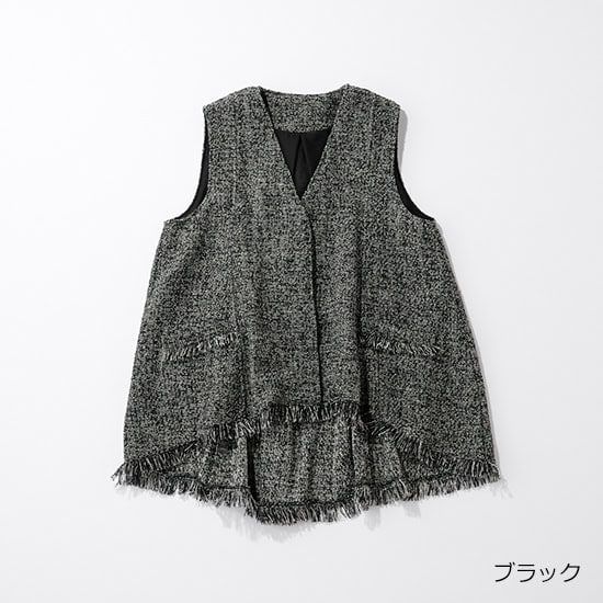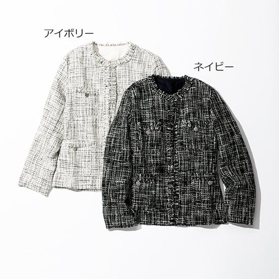 ツイード調のノーカラージャケットは、仕事、ママ友とランチなど幅広いシーンで活躍。ふちのフリンジデザインが、ほんのりカジュアルさを演出してくれます。