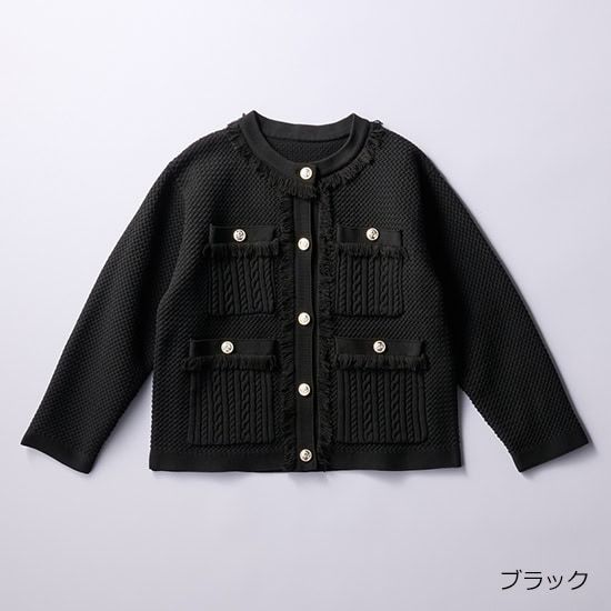 ツィード風のざっくりとしたテクスチャーのある編み地にフリンジをあしらい、品のある落ち着いた金ボタンを施した、きちんと見えするニットジャケット。柔らかく動きやすく、1日来ていてもお疲れ知らず。デニム合わせなどカジュアルな着こなしにもマッチするうえ、学校行事やお仕事シーンにも使える、何かと使えるジャケットです。